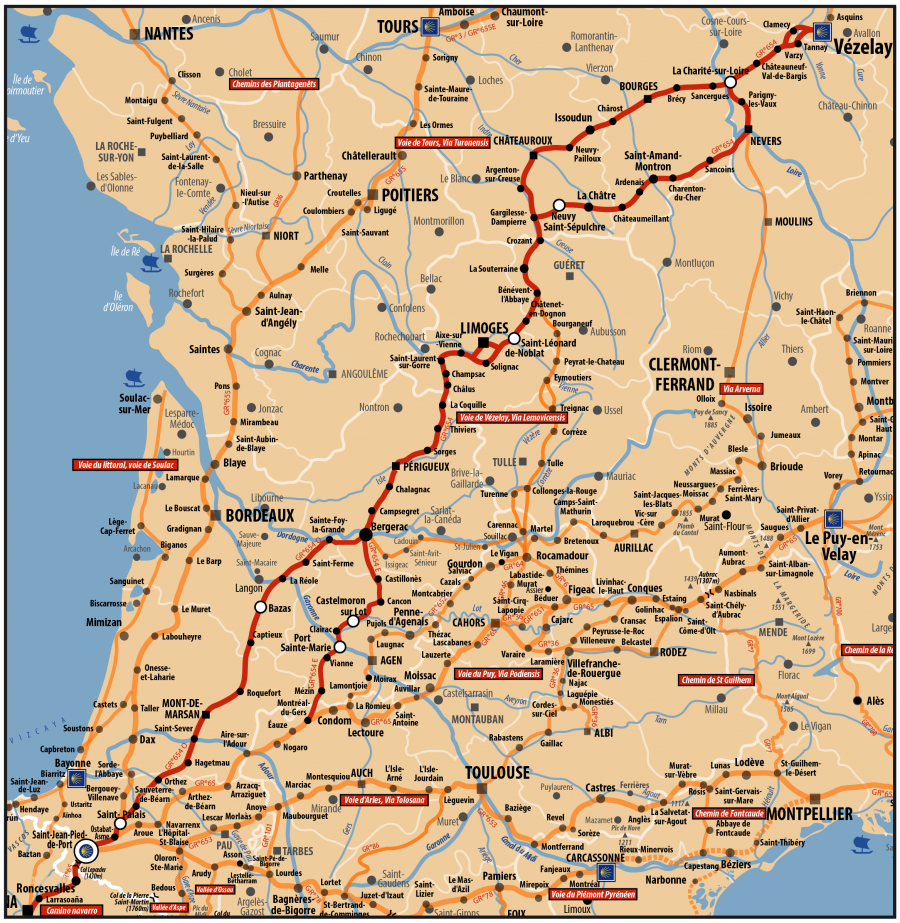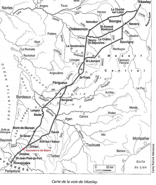 Via Lemovicensis, 1680 km séparent Vézelay de Compostelle. La voie de Vézelay ou voie limousine entre en Béarn des Gaves à Sault de Navailles, fait une halte à Orthez (Hôtel de la Lune) puis se rend à Sauveterre en passant par l’Hôpital d’Orion. Elle est aussi connue sous l’appellation GR654.